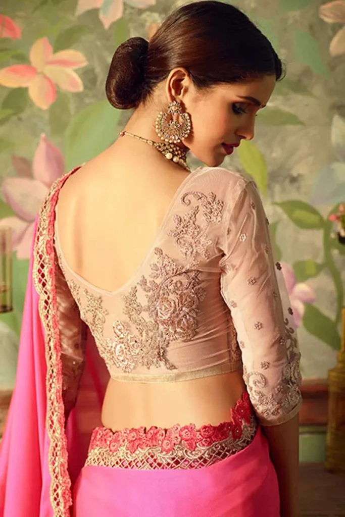 - Net or chiffon sarees – light and allows the blouse to be the center of attention.